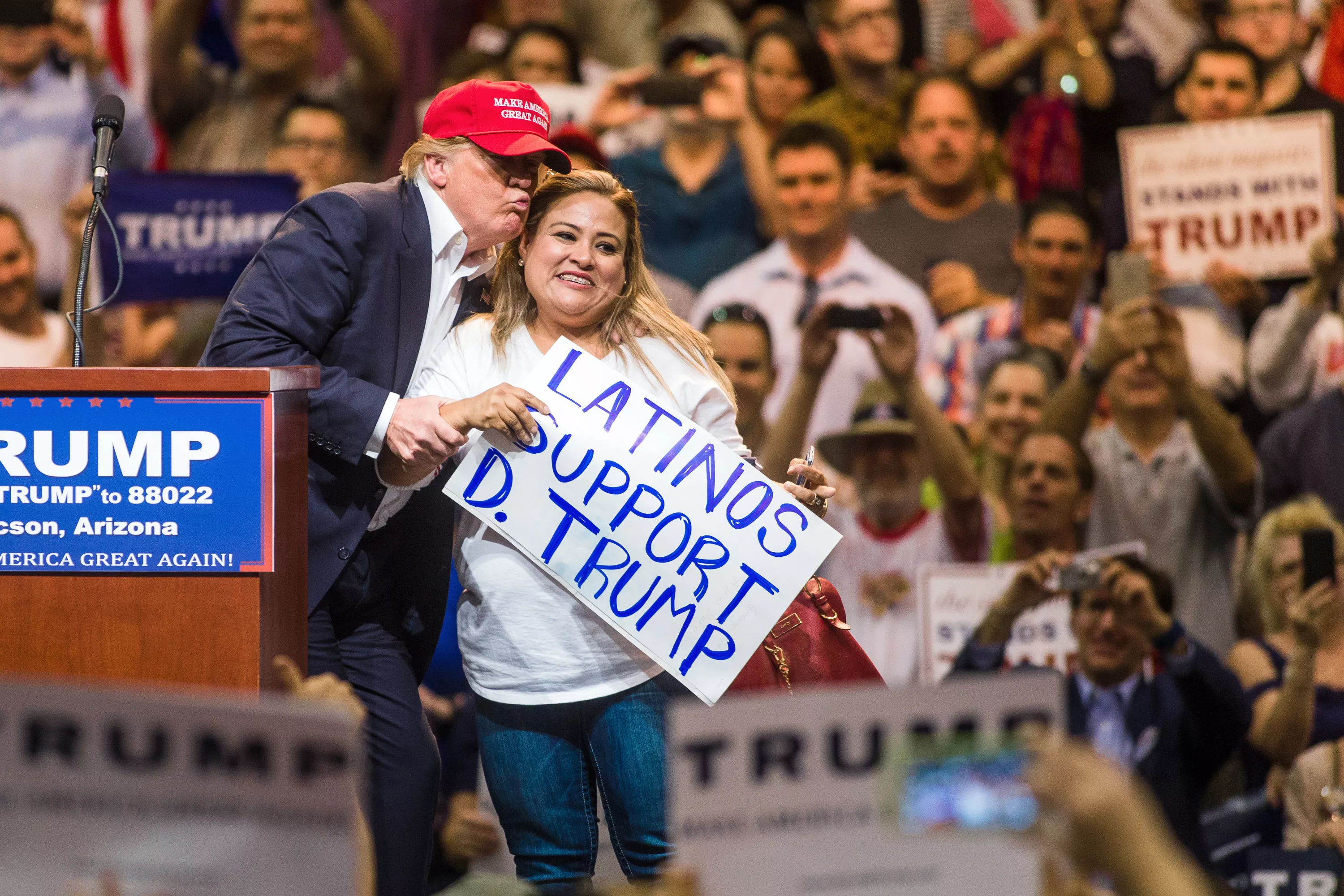 Donald Trump poses for a supporting with a "Latinos Support D. Trump" sign in the middle of the rally.
