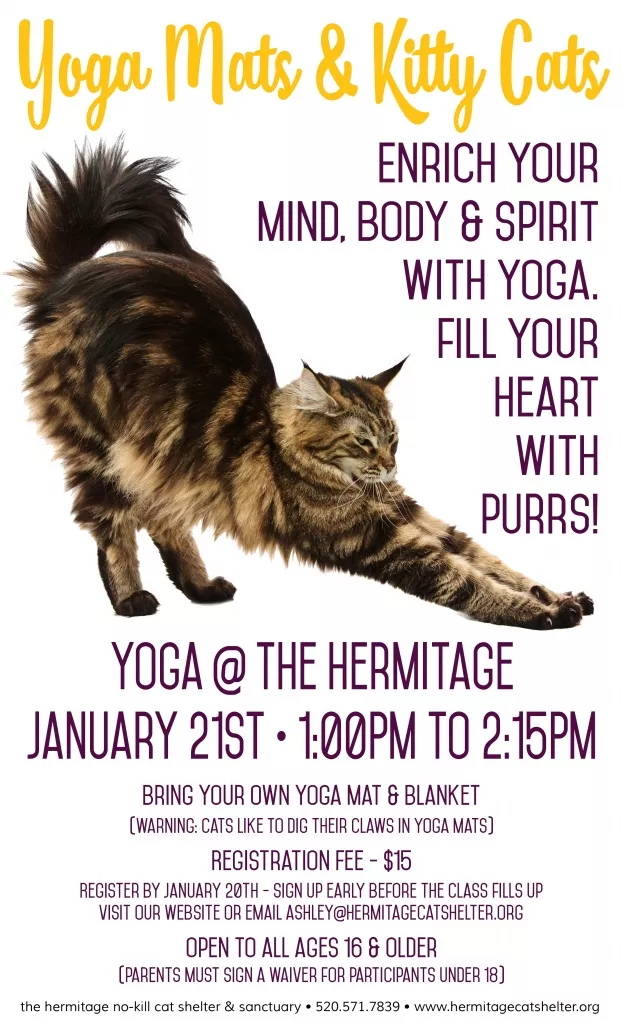 Cat Yoga. The Hermitage No-Kill Cat Shelter & Sanctuary is here to give you the time of your life. Say goodbye to the downward facing dog and hello to the calmness-facing cat. Bring a yoga mat (and be warned that the kitties tend to dig their claws into the mats) and a blanket, but leave your cat allergy at home, if you have one. You’ll be feline serene in no time. 1 to 2:15 p.m. Sunday, Jan. 21. The Hermitage, 5278 E. 21st St. $15, register by Saturday, Jan. 20 before the spots run meowt.