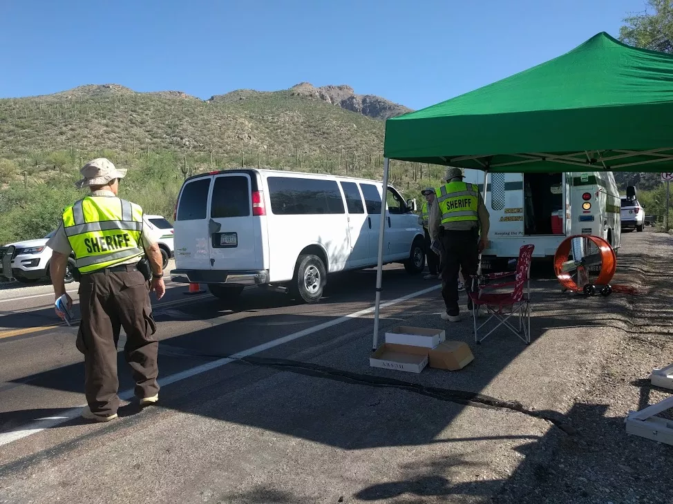 A group of county sheriff’s auxiliary volunteers have begun setting up at the base of the mountain every Saturday and Sunday, distributing fire safety fliers to passing motorists. The fliers, created in collaboration with Pima County District 4 Supervisor Steve Christy, include orders like “No campfires! No barbecues!”