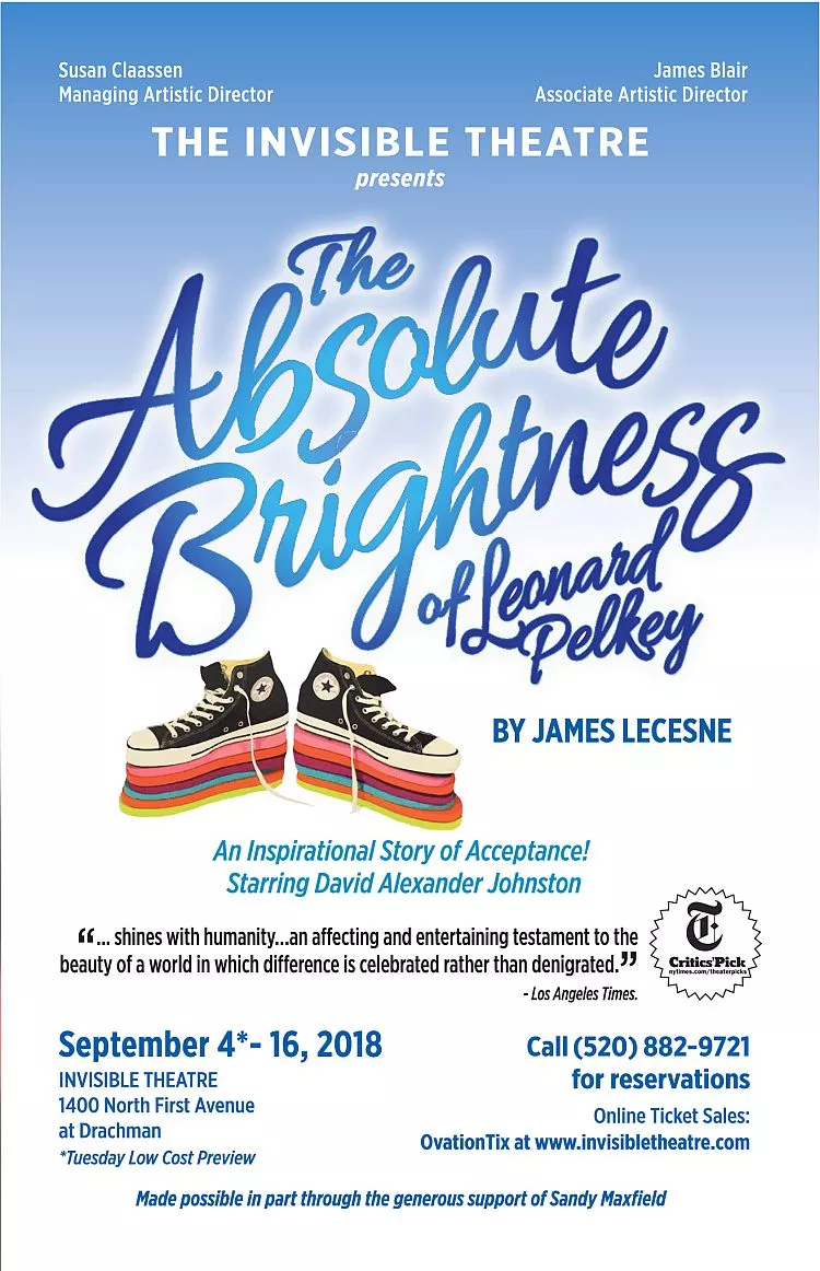 The Absolute Brightness of Leonard Pelkey. The Invisible Theatre is kicking off its 2018-2019 season with the Arizona premiere of this play by James Lecesne. You could call it a one-man show but only in a sense: There’s one actor portraying every character in a small Jersey Shore town. The plot concerns the disappearance of 14-year-old Leonard Pelkey, a tenacious and flamboyant force of nature who drives home for the whole town the lesson that you don’t know what you have until it’s gone. As the search goes on, the town’s residents find themselves questioning what means the most to them and what they leave behind. Tuesday, Sept. 4 through Sunday, Sept. 16 with showtimes at 3 and 7:30 p.m., depending on the day. The Invisible Theatre, 1400 N. First Ave. $35 GA