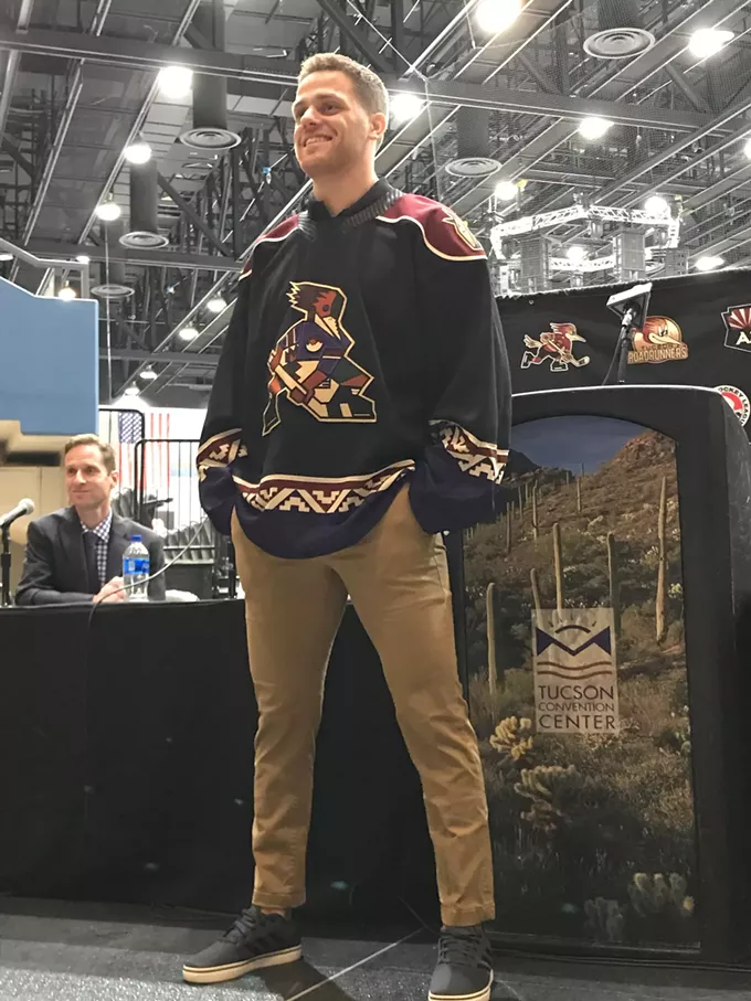Tucson Roadrunners' captain Dakota Mermis models the team's new alternate Kachina-themed uniforms on Monday.