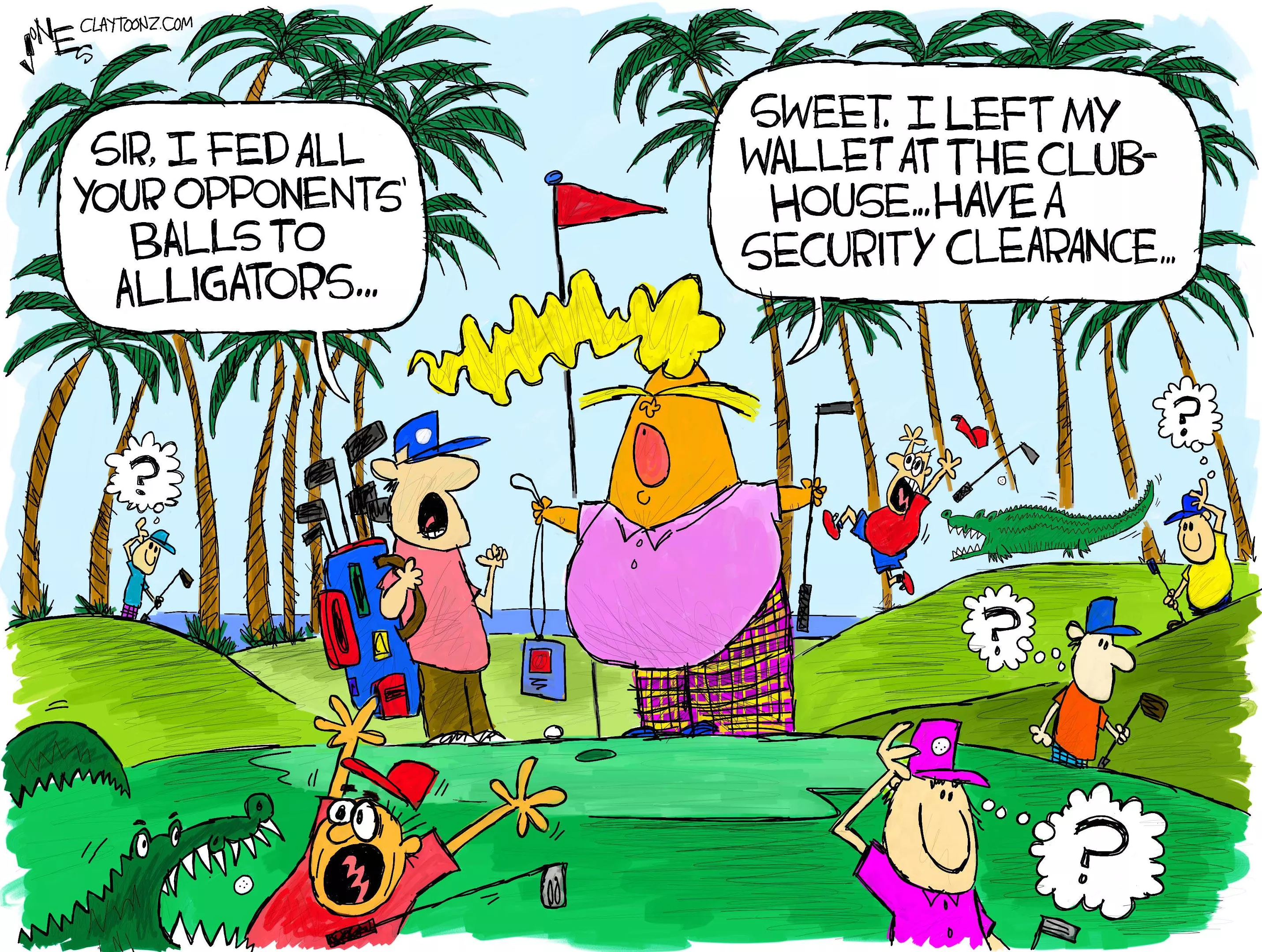 Tags: comics , politics , cartoons , Claytoonz , golf , Mar a Lago , alligators , security clearance , Trump , golf balls , president , Image