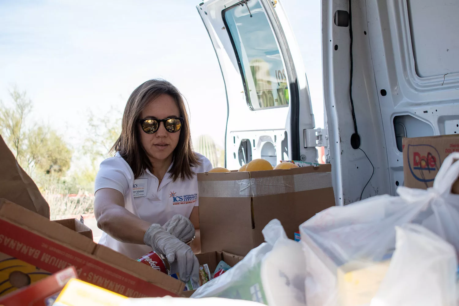 Lauryn Valladarez sorts through dry goods in the ICS van.