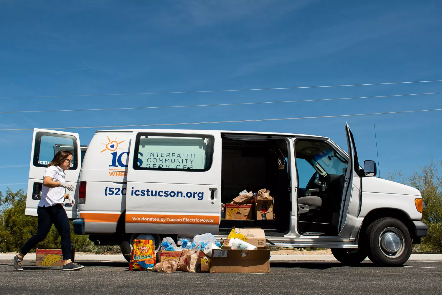 Interfaith Community Services Faith and Community Outreach Manager Lauryn Valladarez loads donated food and cleaning supplies into an ICS van parked at St. Mark the Evangelist Catholic Church in Oro Valley (2727 W. Tangerine Road). ICS is taking donations until 2:30 p.m.