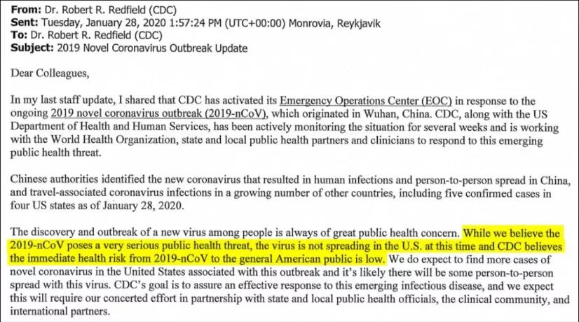 “Confronting global outbreaks and protecting Americans is what we do,” Redfield wrote in the message. “More and more, people are turning to us for guidance, and we respond consistently with evidence-based information and professionalism.”