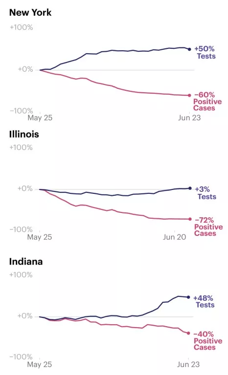 In some states, such as New York, Illinois and Indiana, testing has stayed about the same or increased while the share of positive tests has dropped.
