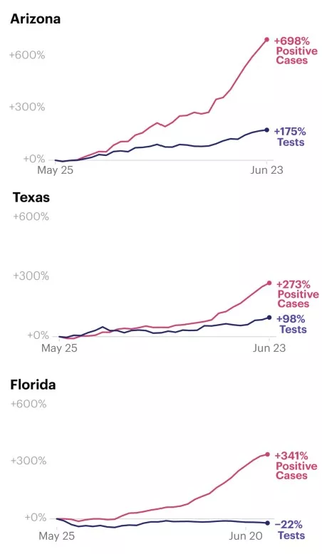ProPublica looked at changes in the seven-day average of COVID-19 tests performed and the change in the overall number of positive tests in each state from Memorial Day, May 25, to Tuesday. By Memorial Day,