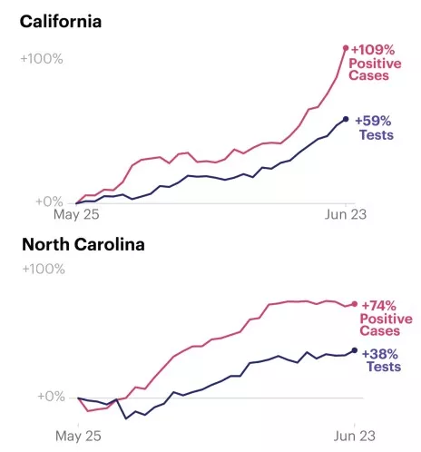 A handful of states, including California and North Carolina, saw increases in both testing and in positive results that roughly tracked each other, though the increase in positive cases outpaced the increase in testing. In the case of California, the share of positive results has recently pulled away from any increase in testing. California reported more than 7,000 new infections on Wednesday.