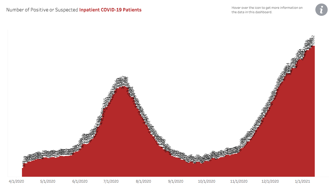 A record number of 1,183 COVID-19 patients were in intensive care unit beds on Jan. 11. The summer’s record number of patients in ICU beds was 970, set on July 13. The subsequent low was 114 on Sept. 22.