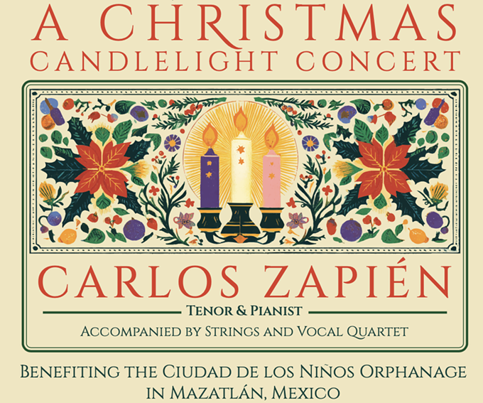 Enjoy an evening of Christmas carols by tenor and pianist Carlos Zapién, with strings and a vocal quartet, in candlelight. To benefit the Ciudad de los Niños Orphanage, Mazatlan, Mexico.