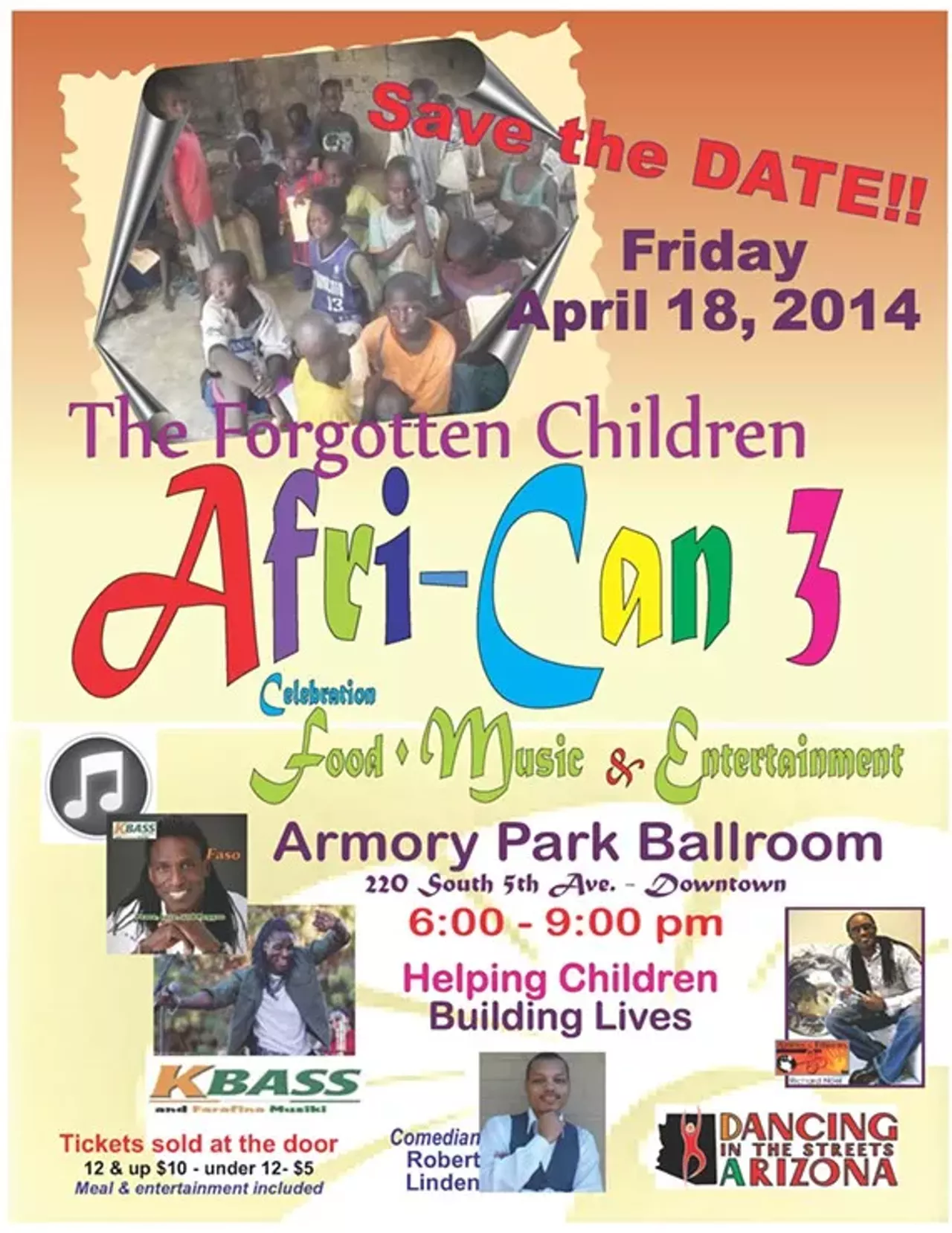A celebration features African Reggae/Afro-Pop stars K-Bass and Farafina Musiki (kbassmusic.com), stand-up comedian Robert Linden, Arizona’s “Dancing in the Streets”, singer Kaylie Foster, foods donated by local restaurants and more. Benefits the nonprofit The Forgotten Children (theforgottenchildren.org ), providing a home for homeless orphans in Senegal, Africa.