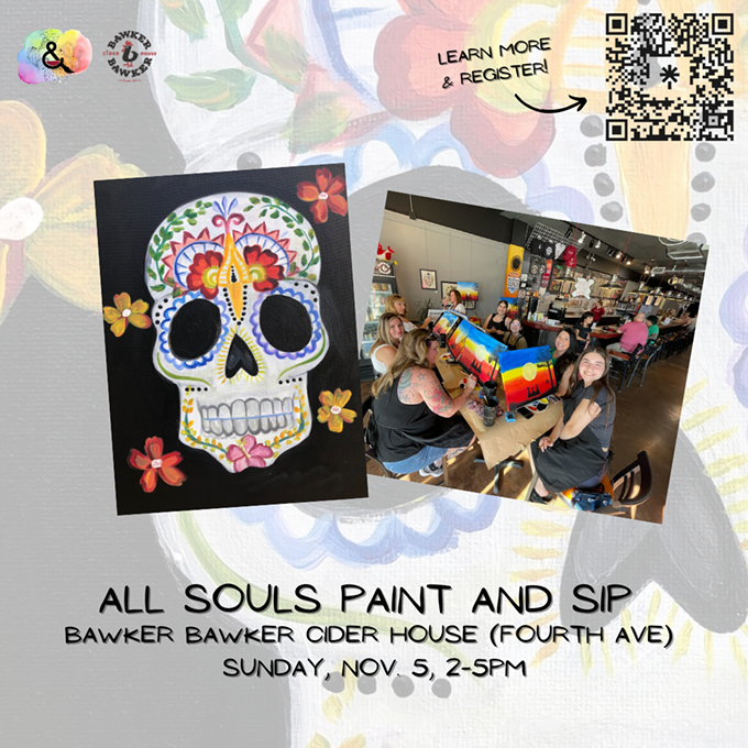 Instructor Emma will guide you throughout the three hour lesson to help you recreate this Día de los Muertos-inspired All Souls painting. Celebrate Day of the Dead at Bawker Cider!