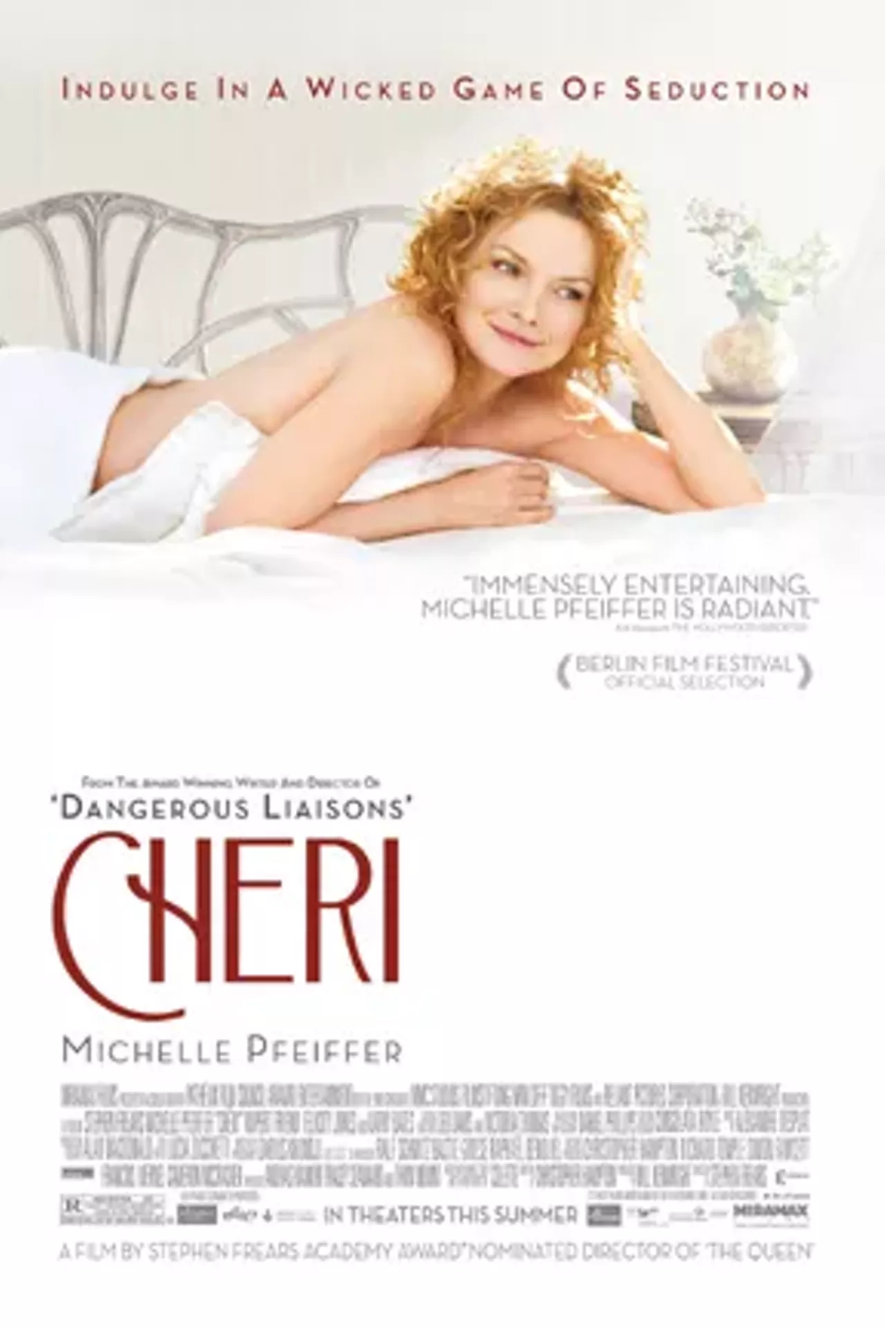 The latest film from veteran director Stephen Frears reunites him with his Dangerous Liaisons writer Christopher Hampton and star Michelle Pfeiffer for a lush but frigid blend of a couple of Colette works about a retired prostitute and her young lover. The film’s fatal flaw: Zero chemistry exists between Pfeiffer’s worldly Lea and the pouty Rupert Friend—he’s like a poor man’s Orlando Bloom—as Chéri. Without tangible evidence of their allegedly deep connection, it’s tougher to appreciate the film’s actual charms, such as Darius Khondji’s deft cinematography, the luscious Belle Époque costuming, and a scenery-chomping Kathy Bates as Chéri’s mother and Lea’s frenemy. The gorgeous Pfeiffer does what she can with an uninvolving role that forces her to stifle her emotions. While there’s an interesting parallel to be drawn between an aging whore and a middle-age movie star, it’s trapped under frustrating layers of ice.