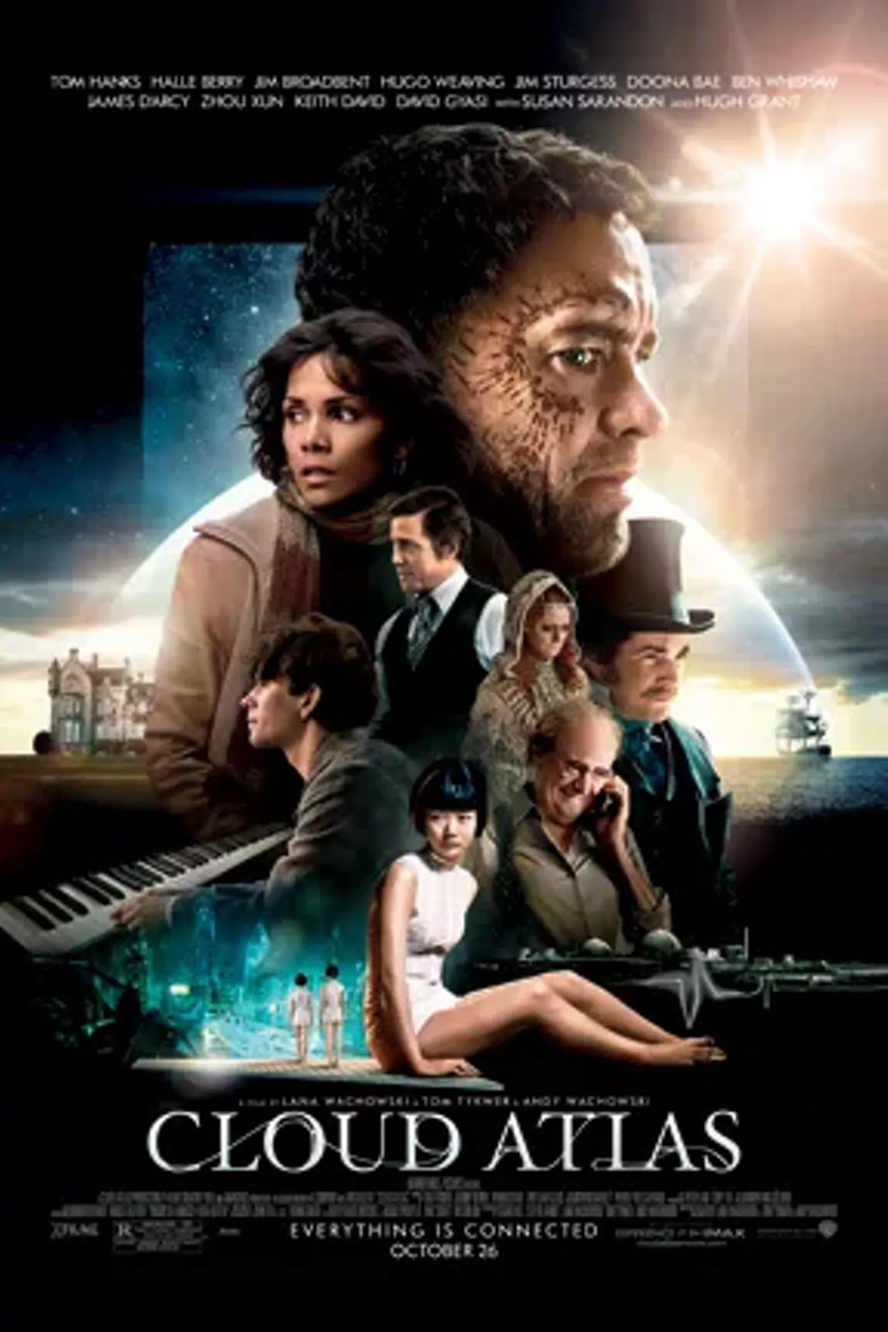 Apparently, we’re all connected. Not just now, but for (and through) all time. That’s the premise of David Mitchell’s award-winning novel, Cloud Atlas, and of the movie it inspired. However, the film lacks cohesion, despite the fact that the same actors—including Tom Hanks, Halle Berry, Hugh Grant, Jim Broadbent, Jim Sturgess and Hugo Weaving—appear in many of the movie’s six distinct stories. A couple of these interconnected chapters have a lot of potential, but the finished product is a mess. A dystopian Neo Seoul of the near future plays the best, which is not surprising given that the film was co-directed by Lana and Andy Wachowski (The Matrix) and Tom Tykwer (Run Lola Run). That should have been the whole movie, frankly. Juggling all of it at once, even over nearly three hours, is too cumbersome to enjoy or fully appreciate.