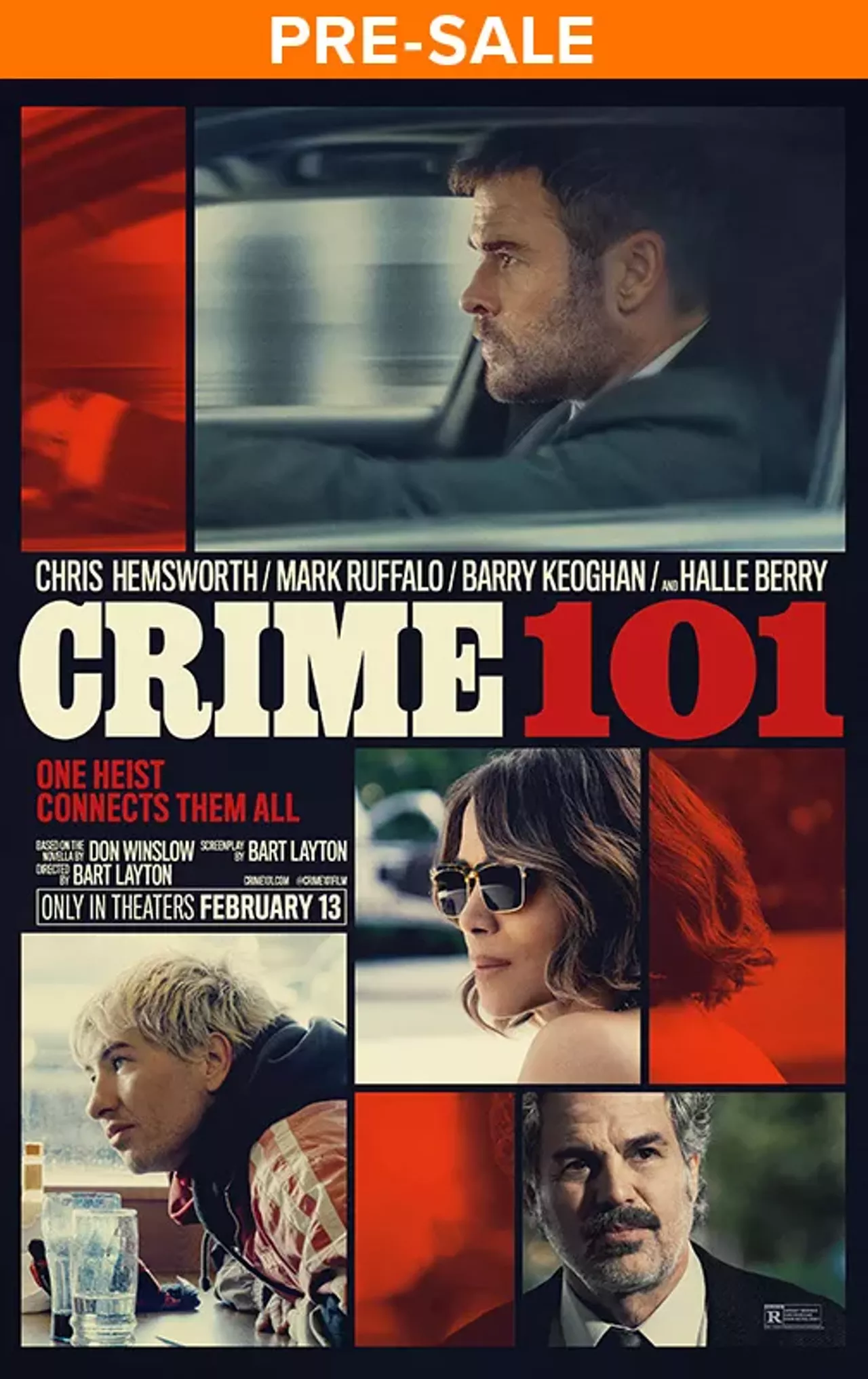 Set against the sun-bleached grit of Los Angeles, Crime 101 weaves the tale of an elusive jewel thief (Chris Hemsworth) whose string of heists along the 101 freeway have mystified police. When he eyes the score of a lifetime, his path crosses that of a disillusioned insurance broker (Halle Berry) who is facing her own crossroads. Convinced he has found a pattern, a relentless detective (Mark Ruffalo) is closing in, raising the stakes even higher. As the heist approaches, the line between hunter and hunted begins to blur, and all three are faced with life-defining choices–and the realization that there can be no turning back.