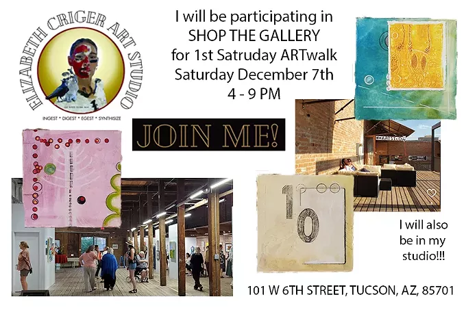 Elizabeth Criger Art Studio will be open for the 1st Saturday ARTwalk event "Shop The Gallery". There will be 13 participating artists! December 7th, 4-9PM. 101 W 6th Street, Downtown