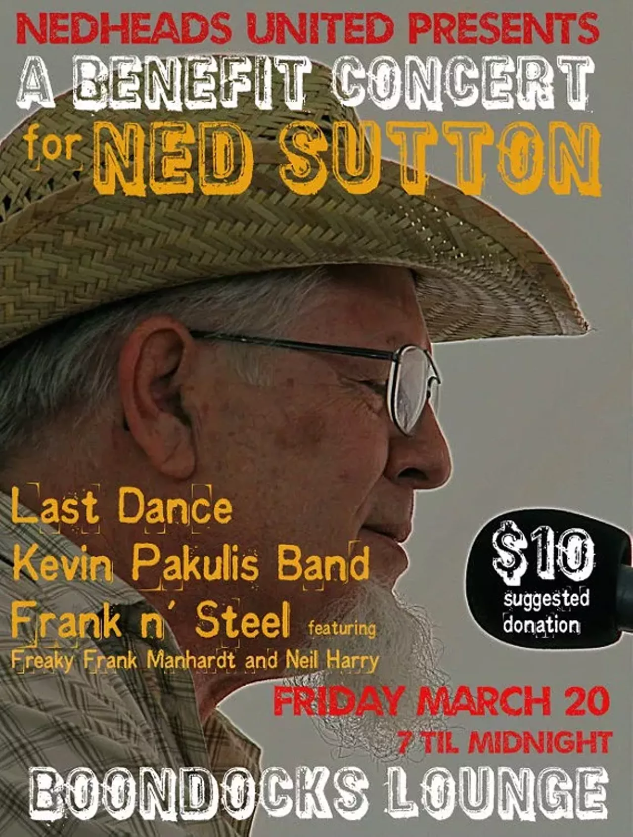 Beloved Tucson troubadour Ned Sutton has had some challenging health issues of late and his friends are gathering to lend an hand. Ned's band Last Dance, Kevin Pakulis Band, and Frank n' Steel (featuring Freaky Frank Manhardt and Neil Harry) will all play a set, joined by guest artists.