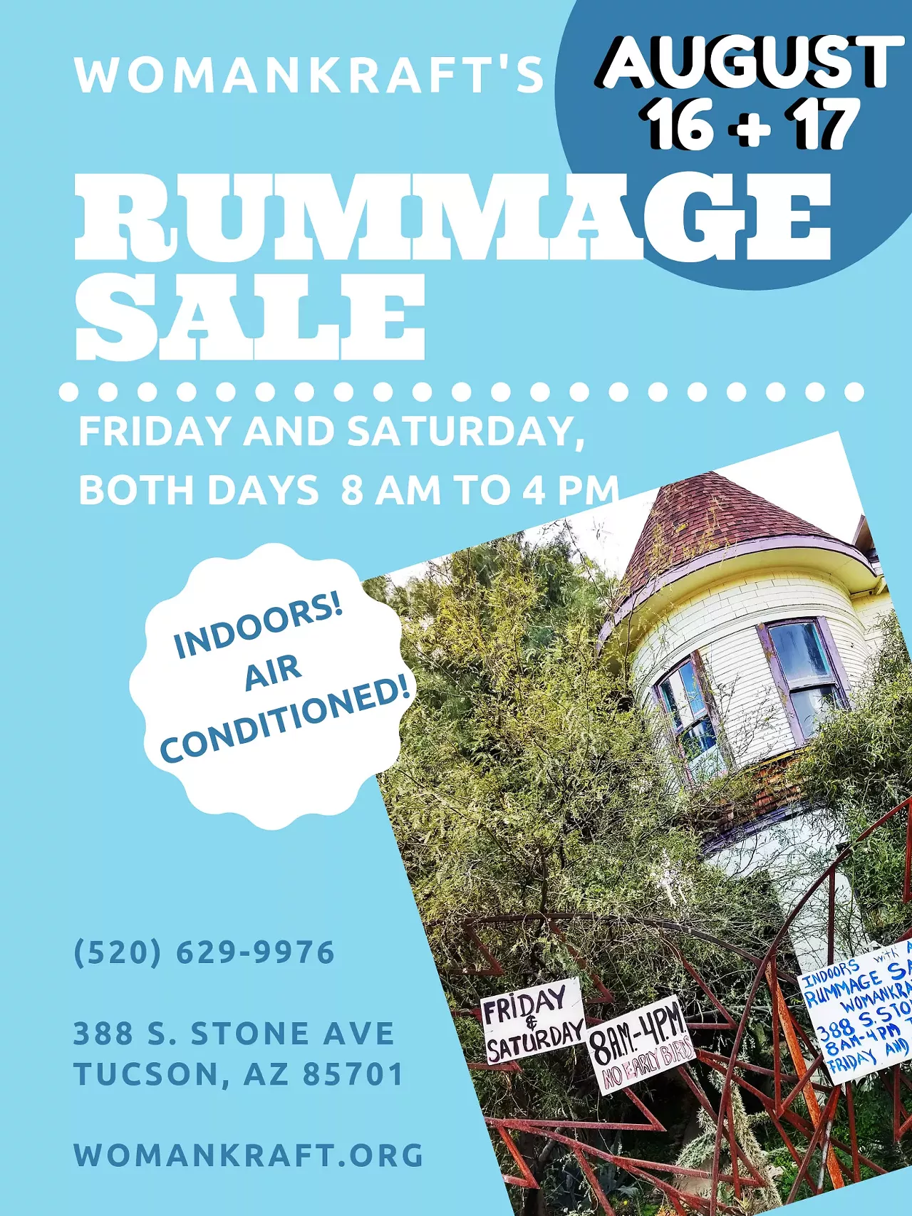 Rummage Sale benefiting WomanKraft Art Center. We have a lot of everything. Craft supplies, clothing, books, homewares, furniture. August 16th and 17th 8AM-4PM. 388 S. Stone Ave.