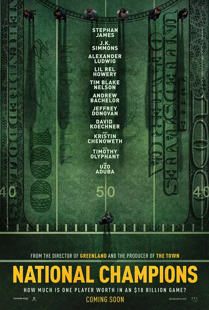 Three days before the college football national championship game, star quarterback LeMarcus James (Stephan James) and teammate Emmett Sunday (Alexander Ludwig) ignite a player’s strike declaring they won’t compete until all student-athletes are fairly compensated. With billions of dollars at risk and legacies on the line, the stakes could not be higher. Now, with only hours until kickoff, the head coach (J.K. Simmons) and various power brokers (Lil Rel Howery, Tim Blake Nelson, Andrew Bachelor, Jeffrey Donovan, David Koechner, Kristin Chenoweth, Timothy Olyphant, Uzo Aduba) must race against the clock to protect or destroy the prevailing collegiate athletics system.