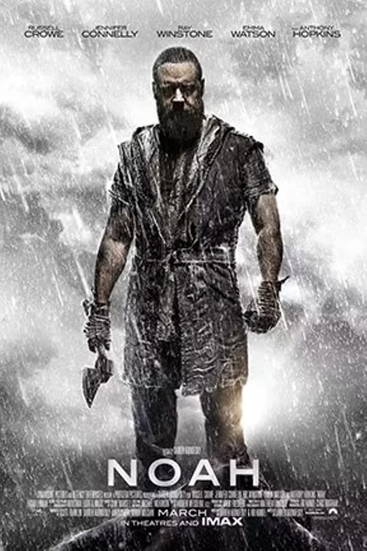 When God decides that mankind has become too sinful and must be wiped off the Earth, he chooses Noah (Russell Crowe), a pious man, for a great task. Noah must build an ark large enough to hold his wife (Jennifer Connelly), adopted daughter (Emma Watson), sons (Logan Lerman, Douglas Booth, Leo Carroll) and their wives -- plus breeding pairs of every animal. When the task is completed, Noah and his family witness God's wrath in the form of an apocalyptic flood.