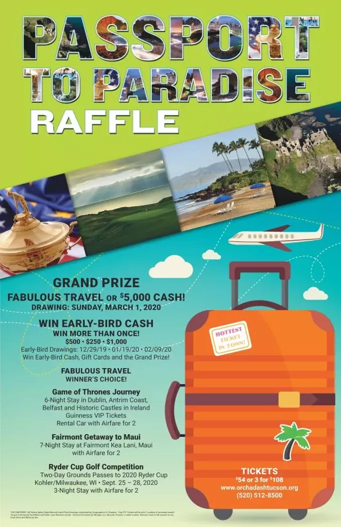 Passport-to-Paradise $1,000, Early-Bird Drawing - Sunday, February 16th - Grand Prize Drawing March 9, 2020. Don't delay ... purchase your raffle ticket today! Remember, you can win $1,000 early-bird