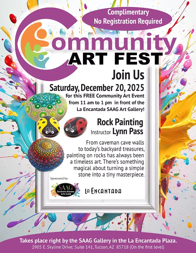 Turn a stone into a backyard treasure. Saturday, 12/20 during the SAAG Gallery’s Community Art Fest, 11-1. Rock, paints provided. Free. Art Fest held the 3rd Saturday of the month.