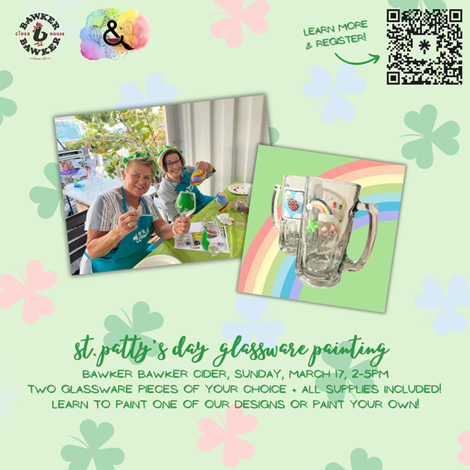 Join Emma for St. Patrick’s Day beer stein, wine glass, and/or glass coffee mug painting at Bawker Bawker Cider House! Beginner-friendly art class! Each participant will paint two glassware items.