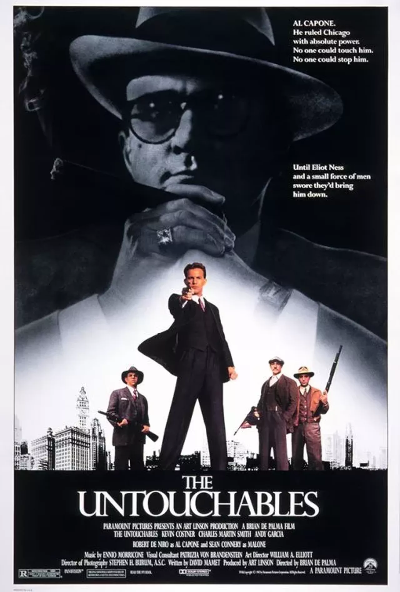 After building an empire with bootleg alcohol, legendary crime boss Al Capone (Robert De Niro) rules Chicago with an iron fist. Though Prohibition agent Eliot Ness (Kevin Costner) attempts to take Capone down, even his best efforts fail due to widespread corruption within the Windy City's police force. Recruiting an elite group of lawmen who won't be swayed by bribes or fear, including Irish-American cop Jimmy Malone (Sean Connery), Ness renews his determination to bring Capone to justice.