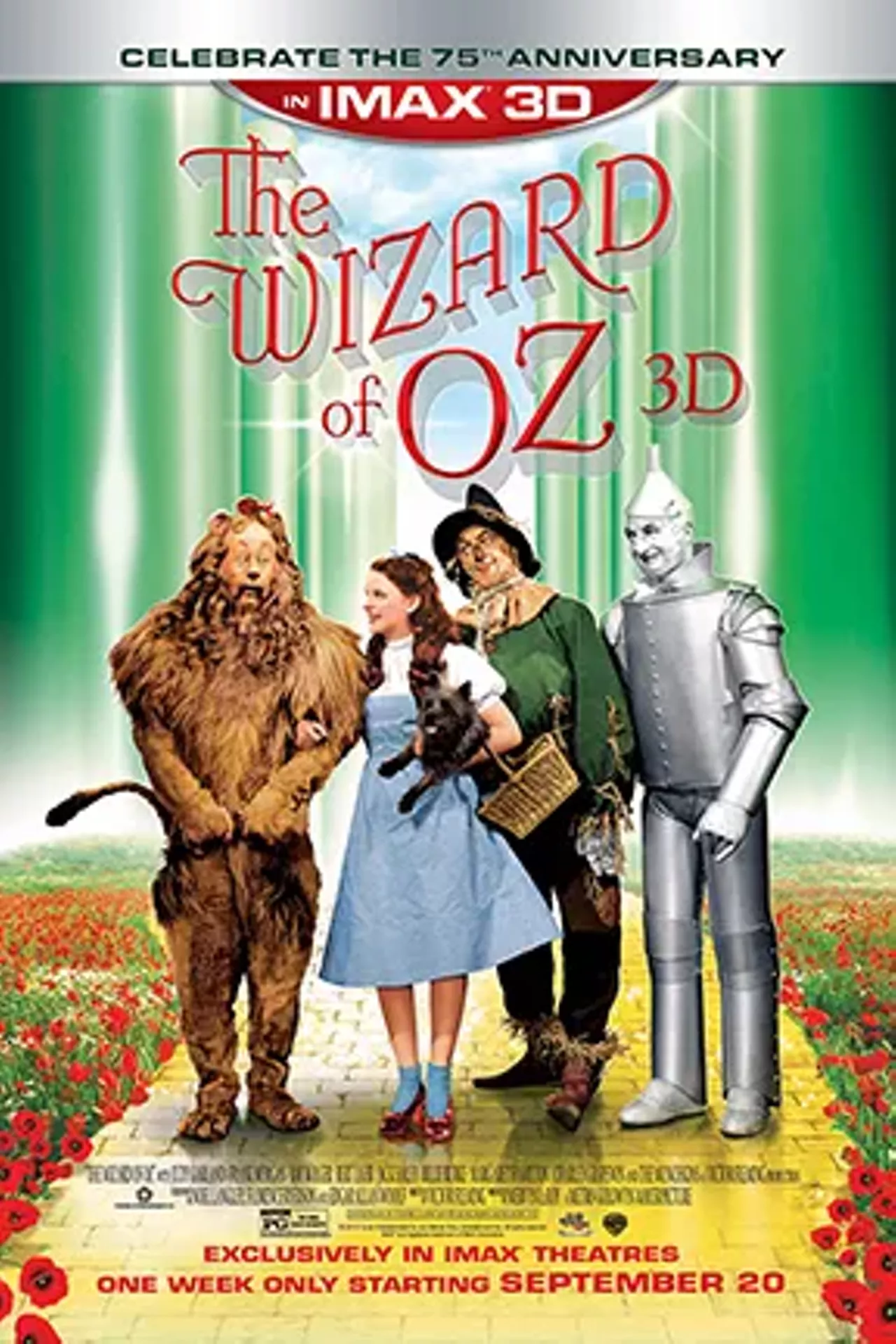 When a tornado rips through Kansas, Dorothy (Judy Garland) and her dog, Toto, are whisked away in their house to the magical land of Oz. They follow the Yellow Brick Road toward the Emerald City to meet the Wizard, and en route they meet a Scarecrow (Ray Bolger) that needs a brain, a Tin Man (Jack Haley) missing a heart, and a Cowardly Lion (Bert Lahr) who wants courage. The wizard asks the group to bring him the broom of the Wicked Witch of the West (Margaret Hamilton) to earn his help.