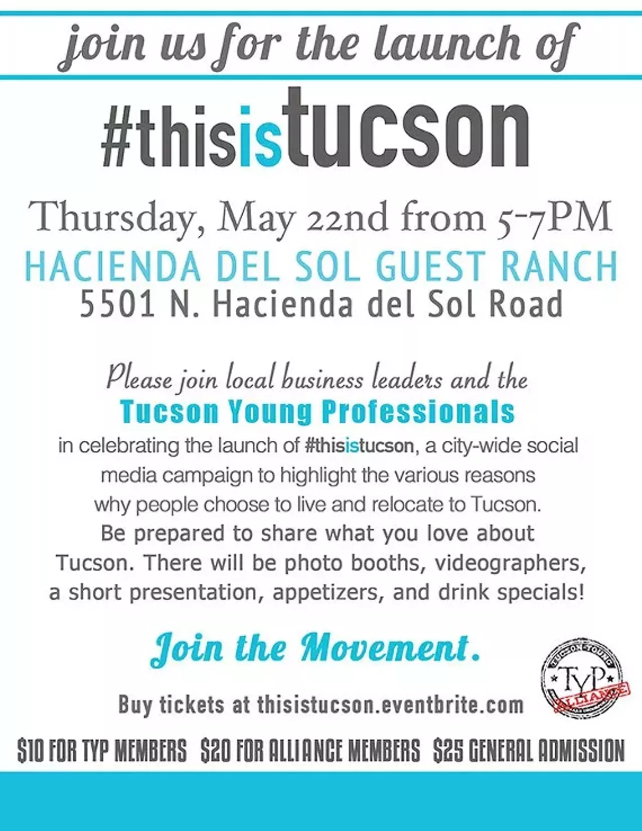 Join community business leaders and the Tucson Young Professionals in celebrating the launch of #thisistucson, a city-wide social media campaign to highlight the various reasons why people choose to live in Tucson. Appetizers and a drink ticket will be provided to all guests.