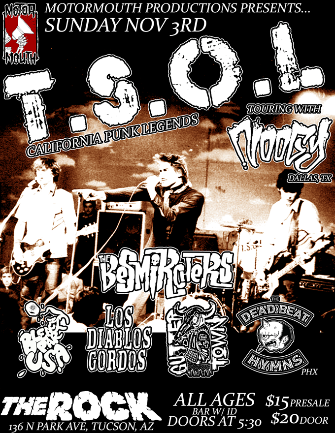 Returning to Tucson in over a decade, legenday CA punk rockers T.S.O.L.! Touring w/Noogy (TX) + the Besmirchers, GutterTown, BleachPartyUSA, LosDiablosGordos, & the deadbeat hyms (Phx).