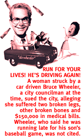 Former City Councilman Bruce Wheeler was arrested on suspicion of drunk driving when cops saw his car swerve into a median on Fourth Avenue. Wheeler said he'd had several beers at a St. Patrick's Day party. SEVENTH INNING STRETCH MARKS In an effort to get fans into the ballpark, the Palm Springs Suns minor league baseball team decided to stage nude fans night. The event, which was later dropped, was to be sponsored by the clothing-optional Terra Cotta Inn in Palm Springs. "Our normal dress code is tennis shoes, socks and a baseball cap," said shop owner Tom Mulhall. IT WAS ILLUSTRATED WITH A PICTURE OF EDITOR STEVE AUSLANDER IN A BLACK KEVLAR BRA, A RUBY BELLY BUTTON AND FUR-LINED HANDCUFFS The Arizona Daily Star gave nearly an entire page of its Accent section to a Penthouse magazine-style story on a store devoted to kinky sex, bondage, and fetishes. Star writer Bryn Bailer called it a ''quirky boutique." JOINT VENTURE U.S. Customs inspectors found 155 pounds of marijuana on a bus at the Nogales border crossing. The bus was carrying 31 Mexican school children to Tucson on a sightseeing trip. A MAN AND HIS COCK Protesting a law that would ban cockfighting in Arizona, Frank Celaya removed his artificial leg, showed it to members of a legislative committee, and told lawmakers he had lost his limb fighting in Vietnam. "If this is not enough for my country, to be able to come and fight chickens whenever I want to fight chickens, then what is this country coming to?'' Celaya asked.