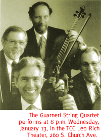 FRETTING FRIENDS. Just when you were overdosing on Garth, along comes music with actual integrity. We're talking none other than the Guarneri String Quartet, presented by the Arizona Friends of Chamber Music. Featuring Arnold Steinhardt on violin, Michael Tree on viola, John Dalley on violin and David Soyer on cello, the New York-based Gaurneri is the longest continuing quartet in the world. And their acclaim steadily grows: Following a concert of Beethoven's work, the Los Angeles Times noted that they "looked like hardworking musicians, but they played like angels." Tonight's repertoire should include Jan Crisóstomo Arriaga's "Quartet No. 2 in A major," Zoltán Kodály's "Quartet No. 2 in D major," and Edvard Grieg's "Quartet in G major." Performance begins at 8 p.m. in the TCC Leo Rich Theater, 260 S. Church Ave. Tickets are $14, $4 for students, and are available by calling 577-3769.