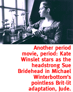 Through all of this we are treated to plenty of flesh and plunging bodices. I don't want to sound prudish, but what is it with "arty" period films? It seems like those movies that should be the natural choice to take one's grandmother to turn out to be the ones filled with groping and grunting. Are we that nostalgic for repression? Jude just makes the matter more confusing, because it's a message movie, and the message it delivers is this: The church, and the stringent morality of Victorian times, are malignant forces that crush true love and religious feeling. This is not exactly a hot topic for 1997.