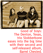 "Universal had something for us, but in a sick way," says Best. "They told us they wanted us because they thought the movement would be big, not because they liked us. It soured us to the whole experience. There were lots of dinners and handshakes, but nobody really wanted us." So Slobberbone made the new record for themselves, and they're better for it. Barrel Chested, their second full-length, has its share of force. Cathartic and powerful, the melodically focused "Engine Joe" is a song about the local guy who fixes cars. "There's been girls who've loved me, but I cheated on them, with a woman named Whiskey, and Gin her best friend," sings Best in "Get Gone Again." Bruising guitars augment Best's everyday-sounding vocals. "I'll Be Damned," the record's sprawling seven-minute-long focal point, heaps on the lover's anguish, burning like a mattress on the fire-to-end-all-relationships fire. The song flares with emotional intensity, and doesn't end so much as it comes undone. "There's a bit of a misconception that if you sing about that kind of thing you're someone who stumbles around all of the time," Best says. "Don't read my lyrics too literally. Drinking and alcoholism are perfect metaphors for other problems, like relationship problems." For a band on the road, home isn't your address, but anywhere you happen to be. From small things, big things one day come. Denton's just as big as Lubbock, Texas, the town that spawned Buddy Holly. For better or worse, these three will try to take their musical vision somewhere...bigger. Out of the corner bar, and into every corner of the world with tales of the corner bar. "We know that Slobberbone is a silly name," says Best. "It was one of those things we came up with when we were drinking beer and hanging out in the backyard. When we rise above the stigma of that name, we know we'll have finally made it."