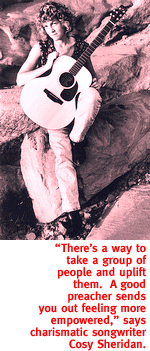 Sheridan is sure to shine, with smooth and practiced guitar playing, a singing voice that sweetly defies her rougher speaking voice, and a magic bag of songs on topics ranging from ballads on the state of relationships to jazzy commentary on government spending. This is not another folk singer with a soapy box, however. "I don't want to bring my hammer," Sheridan says. Instead, she brings an undeniably refreshing charm to the stage. Her politics are delivered with a sprite-like, humorous sparkle. If Sheridan's ever accused of hammering a point home, it is only because her deft use of metaphor provided the thrust. Others are noticing the impact of her talents. Sheridan is a winner of Kerrville's prestigious New Folk Award, and that, combined with a Telluride Bluegrass Festival Troubador Award, places the eyes of acoustic music fans and critics upon her. With three albums to her credit, and the recent release of One Sure Thing, a live CD recording, Sheridan is rapidly becoming a veteran of studios and stages across the country. One Sure Thing is a taste of the verve and vivacity that concert-goers can expect from her on-stage performance. "If you show up with some notes and an outline and you open yourself up to whatever that moment wants, something quantum or religious happens, and you're going to add something to the world," she says. My desire is to be in the room in the moment. I think, therefore I'm contributing to the world. "The audience gives you palpable energy. With a good audience you find what you say is much more interesting--200 sets of gray matter giving you their energy--you've been augmented." The audience-as-community ideal has been popularized by acoustic well-knowns such as Greg Brown and Leo Kottke. Sheridan's take is decidedly sincere: "There's a way to take a group of people and uplift them. A good preacher sends you out feeling more empowered. The over-abiding process at work here is that you are not a small random piece in the water pounding against the rocks." Originally from New Hampshire, Sheridan made the journey west in 1994, and now resides in Utah. She's currently working on songs for another album and looking into taking a college correspondence course in comparative religion.