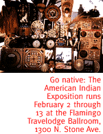 NATIVE EXPOSURE. Native American crafts from across the United States and Canada roll into town today, as the two-week American Indian Exposition gets underway. More than 20 vendors will be on hand, along with demonstrations by several artists, including drum painting by Sonja Holy Eagle of the Lakota Tribe, and a booksigning by expo organizer Fred Synder. Free event runs daily through February 15 in the Travelodge Flamingo, 1300 N. Stone Ave. For information, call 622-4900.