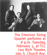 Phantom Gallery hours vary. For times and other details, call 624-4994. PHILOSOPHICAL STRINGS. They took their name from a philosopher, and learned their chops at some of the finest academies around. Now the Emerson String Quartet graces Tucson with the performing skill that's earned them a Grammy and countless other awards. Featuring alternating violinists Eugene Drucker and Philip Setzer, violist Lawrence Dutton and cellist David Finckel, the quartet first gained the national spotlight in 1988 with a Carnegie Hall debut featuring the six Bartók quartets in a single evening. "The Emerson has the traditional string-quartet virtues; each player is a strongly characterized individual, but the ensemble is temperamentally as well as sonically in balance," says The New Yorker. "The four minds play upon each other, and upon the work, in perfect harmony...." Performance is 8 tonight in the TCC Leo Rich Theatre, 260 S. Church Ave. Tickets are $14, $4 for students, and available by calling 298-5806.