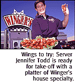 They're still the featured specialties of the house, along with a variety of sandwiches, salads, burgers and entrees ranging from fajitas to chicken-fried steak. The house salad at Winger's ($2.69 alone, or $1.89 extra if ordered with an entree) was a cut above the bagged iceberg lettuce version, but just barely. A few croutons, some red cabbage shreds and a few wedges of tomato unimaginatively rounded things out. But everything was crunchy, fresh and generously portioned. The Caesar salad ($4.49) had lots of crisp romaine, croutons, fresh parmesan and a dressing that, while flavorful, was lacking in the bold splashes of garlic and anchovy some of us hold dear. Soups change daily at Winger's, and I was lucky enough one day to sample a bowl of tomato-based tortilla soup ($2.99). Slightly spicy and redolent with cilantro, the velvety soup also contained chopped tomatoes, corn, carrots, celery and onion. Winger's Buffalo wings, which are fried crisp and topped with a signature sauce, are spicy and slightly sweet (appetizer $4.99, entrees $6.99 or $9.99). Served with celery sticks and ranch dressing, these are tasty noshies unlikely to offend with the overpowering heat of the original upstate New York wings. The St. Louis-style spareribs, which can be ordered full or half rack ($13.99 or $8.99) and topped with either a barbecue (my choice), teriyaki or "Buffalo" sauce, were juicy and tender with barely a trace of fat. Moist towlettes are thoughtfully provided. The chicken-fried steak ($7.49), the menu item that no self-respecting diner would be caught dead without, was also very good--a tender, thinly-sliced cut of beef lightly breaded, fried until golden and then crowned with cream gravy. I had a hard time, however, coming to terms with the fact that there were no mashed potatoes to accompany this dish. The baked potato was nice, but hardly a substitute for an additional conveyer of gravy. The grilled chicken ($4.49), served with the aforementioned choice of sauces, was less successful as an entree. It was dry and flavorless. Along with the ribs and the wings, Winger's is also a purveyor of burgers, a popular menu item judging by the number of plates I saw whiz past. The classic burger with cheese ($4.78) was a medium-sized, well-done patty served with lettuce, tomato and onion. It wasn't the kind of burger that wins a "Best-of" contest, but it will hit the spot if you're experiencing a serious Wimpy attack. A tavern-battered cod sandwich ($4.69) was a vast improvement on the typical fishwich theme: a long kaiser bun covered to its borders with a golden fried piece of cod topped with melted cheddar cheese, lettuce, pickles, tomatoes and tartar sauce. An ice cream-based decadence known as asphalt pie ($3.45), composed of mint chocolate-chip ice cream, Oreo cookie crust, caramel sauce and whipped cream, completed our meal with an added touch of delight. Sure, it's a little campy, and the food won't linger in memory for decades to come. But it's pretty tasty overall, affordable and fun for the kids. These days, that's often enough.