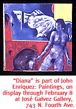 COUNTY CANVAS. Proving that folks beyond Tucson city limits have more on their minds than annexation, the Tucson-Pima Arts Council draws on its creative pondering in The Rural Arts Traveling Exhibition. A total of 51 artists from such far-flung burgs as Ajo, Sells, Green Valley and Cortaro are represented in the exhibit, along with Oro Valley visionaries like Alfred Christensen, Tony Quesada and Margaret Stromer. The 64 works range from sculpture and photography to weaving, painting and basket weaving. The Arts Council's Maryjane Dorofachuk says the show provides rural artists a chance to show their work. "It goes to eight different towns in total, and the work is for sale," she says. "All the money goes to the artists, and it's a good chance to buy some nice pieces. We've already sold 10 of them--in Ajo of all places!" Exhibit runs through March 3, with an artists' reception from 1 to 4 p.m. Sunday, February 9, at the Oro Valley Town Council Chambers, 11000 N. La Cañada Drive. Regular viewing hours are 8 a.m. to 5 p.m. Monday through Friday. Call 624-0595 for information.
