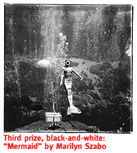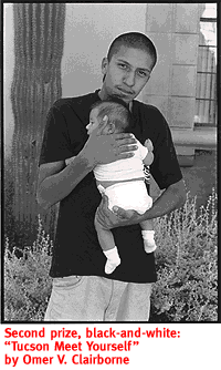 second place went to omer v. clairborne for "Tucson Meet Yourself." Etherton found the work to be "a really nice portrait of probably a father and his new daughter or son." Clairborne wins a $100 certificate for photo processing at Photographic Works. marilyn szabo picked up third-place honors for "Mermaid." Says Etherton, "When I first looked at this picture, I thought it was an aquarium, but it's one of those places in Florida where an actual person goes down in a tank.... The thing I like about it is it's so weird and it's so hard to read the scale on this. I found myself coming back to it and saying, 'That's a really funny picture.' " Szabo wins a $50 certificate for film. A final thanks to our contest sponsors, Bookman's Used Books and Photographic Works Lab.