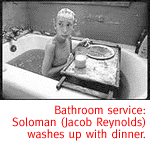 shows Solomon in the bathtub, eating a plate of spaghetti while
