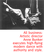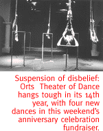 Tracy himself won't be in town to enjoy Tucson's golden winter weather--he'll be driving through the snow to his teaching job at Yale instead--but, he noted, "It's been a while since Pilobolus has been there. It's time for people to see our new work." Over at the Temple of Music and Art, Orts will be celebrating its 14th anniversary with a concert featuring its trademark trapezes, a video and live singing. Four new dances and an older favorite are on the program. Singer Cantrell Maryott will perch high on a swing for "Eye Light," a new solo work by artistic director Anne Bunker and composer Chuck Koesters that commemorates a cousin who perished in an Australia landslide last year. Another Bunker premiere, "Evolving Reflections," was commissioned by the International Glass Arts Society for its convention in town last April. Seven Orts performers danced it then without trapezes, but now it will be seen with trapezes as Bunker intended. Made in collaboration with glass artist Tom Philabaum, the dancers will move to a Koesters video backdrop of glass art being produced.