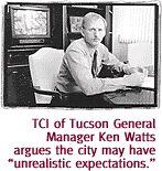 Ken Watts, general manager of TCI of Tucson, says TCI is not in the habit of making agreements it cannot or will not keep. "As a company we don't do that," he says, "and I would challenge anyone to show (that we do)." Watts says the number of changes over the life of the license indicates it was a "bad agreement." He suggests the current dispute may rest with "unrealistic expectations" on the part of the city. Many of the expectations for cable systems can be attributed to industry hype. When TCI took over the cable system here in 1994, the company seemed to be riding a wave of enthusiasm for the technological advances the cable industry was promising its customers. The 500-channel universe was just around the corner, we were told, as were an abundance of high-tech services that would come to us through the same wires that deliver television signals. So it's no surprise people have come to expect that soon they'll be getting high-speed internet access through cable modems. But that promise of a glittering future may have reached its ebb for some consumers, however, when TCI CEO John Malone (who brought the phrase "500-channel universe" into the cable lexicon) announced recently the company was backing off from promises to revamp cable systems so they could deliver television, telephone and interactive computer signals simultaneously. He confessed TCI had been over-ambitious about the upgrades and needed to pull back to protect plummeting stock prices. The company says it still expects to provide increased channel capacity through data compression on most systems, but it plans to limit the necessary upgrades for new technologies primarily to areas where there is direct competition. Thus it's not surprising Tucson and TCI officials are at odds over whether the system here will be upgraded to accommodate new technology. According to Watts, "The city has every right to discuss system capacity...but (TCI needs) to be able to decide on the technology." He says the city wants to establish a citywide internet connection through the cable system. But such a network would not be possible with the compression systems TCI seems to favor. ONE REASON CABLE franchises are so valuable is that historically they've faced limited competition. Industry insiders frequently describe cable systems as "natural monopolies." They argue that setting up the infrastructure for a cable system--receivers, satellite stations, miles and miles of cable, and the like--is so expensive that in most cases it doesn't make sense for a company to construct a cable system where another system already exists. Setting up the second system (which is called an "overbuild" in cable jargon) would mean that two systems would compete for the same consumers, while each spending just as much money setting up the system as if there were only one system. That would force system owners to compete head-to-head with other operators for half the business. The prevalence of one-horse cable towns means that most viewers have had only one cable company to choose from. The consumer's choice in the cable market becomes either subscribing to cable with that company, or not getting cable at all. Until recently, this has meant that consumers either bought cable and got access to its plethora of programming, or went back to watching a handful of local broadcast stations. The appearance of direct broadcast satellite and "wireless" cable systems like DirecTV and People's Choice Television has given viewer's another option, however. While satellite systems still have minuscule distribution compared to cable, in the Tucson area, People's Choice is estimated to have about 30,000 to 40,000 customers. Hunnicutt points out that if TCI's strategy of upgrading systems with competition is real, then Tucson should be high on the list of communities to get such upgrades. But, apparently, it isn't. IN LATE 1996, TCI announced it was taking measures to control costs by cutting expensive cable programming services from many of its systems.
