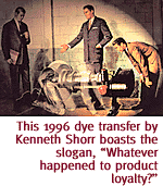 ![]() Kenneth Shorr's Work Reveals The Sick Hucksterism Underlying Modern Life. By Margaret Regan CONSIDER THIS NOT-so-unusual weekend in the life of an average American family. On Saturday afternoon, the mother and daughter attend a big park rally staged by a nonprofit youth group for a thousand or so girls. The festivities on stage are punctuated by periodic announcements of prizes. A local restaurant has "donated" a meal as a prize, and in exchange the grateful youth organization calls out the restaurant's name, oh, 10 times. A costumed employee from the restaurant wanders around the festival, affixing advertising stickers to every girl's shirt. The sticker reads "I love XXX Restaurant." The next day, the whole family of four goes to see a game played by the Harlem Globetrotters, an explicitly commercial enterprise. The taxpayer-owned university arena where they play is studded with billboard advertisements. In between plays, the announcer calls out the names of local businesses who have sponsored the game, and asks the paying audience for their grateful applause. During half-time, the crowds muscle each other around sales booths offering overpriced trinkets that turn out to be advertisements for, you guessed it, the Harlem Globetrotters. So what do you expect? This is the world that capitalism has made, and we inhabit it so unthinkingly that nowadays hardly anyone even notices. (Out of the hundreds of parents partying at the Saturday kids' event, for instance, only one complained about the restaurant's blatant commercial intrusion.) Luckily, there's a lone voice crying out in a wilderness littered with corporate logos. Kenneth Shorr, an artist who teaches photography at the UA, has an explosive new show that denounces the commercialization of our culture. Now on view at the UA Joseph Gross Gallery, Shorr's posters and photographs rage against a variety of targets, including the erosion of civil rights and the simultaneous increase in government power over private life, the arrogance of the U.S. Border Patrol, the racism of the English Only movement, the trivialization of art, what he sees as the scapegoating of men in contemporary life. Most powerfully, though, he posits a world in which commercial and political speech have merged, in which language has become so degraded that it's used exclusively for selling.