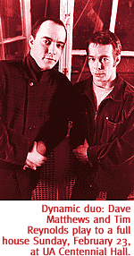 Keeping that gig proved fortuitous for Reynolds. Matthews was doing a stint as a bartender at the club, and writing songs. The two hooked up and began playing together, Matthews sitting in on the occasional TR3 gig and Reynolds helping on demos made in Matthews' basement. While Matthews pulled together DMB and hit the road, Reynolds continued to experiment and record solo. Reynolds recently self-released Gossip of the Neurons, a solo piece recorded live at Millers, showcases Reynolds' fascination with manipulating guitar sound into spacey, textural compositions. It contains some traditional song structures, but half the recording is improvised, as Reynolds feels "most honest music is off the cuff." Reynolds and Matthews have a comfortable musical relationship. When DMB gathers to make a recording, Reynolds goes with them. Not an official member of the band, he's nonetheless billed as "special guest" on the two DMB releases on RCA Records. (You can spot a picture of Reynolds in a photo montage in the liner notes for Under the Table and Dreaming. To the lower left of a photo of Matthews dramatically flashing a peace sign, Reynolds grins broadly.) Special guest status is perfect for Reynolds, as it brings him the financial benefits of playing on DMB releases while allowing him to concentrate on his solo projects and TR3. When the band is taking a break but Matthews wants to play on, Reynolds accompanies him, adding solos and texture to DMB songs while Matthews plays acoustic guitar. The duo did the first such acoustic tour in early 1996 while DMB awaited the release of Crash. The sold-out Tucson show on Sunday, February 23, is the last date on the duo's six-week tour. They'll be performing all the DMB songs the full band plays, plus an occasional Reynolds tune. Though Blues Traveler's John Popper and DMB bassist Lessard joined the duo for a show in the northeast, most of the tour has been just Matthews and Reynolds having fun and playing loose with the DMB catalogue. The format allows for some experimentation, which Matthews encourages. "If we come up with some crazy noise during sound check, Dave is into using it for the show," says Reynolds, quick to add that the basic song structure remains--no disintegration into mindless noodling. Recent shows have also included the occasional cover--John Prine, David Bowie, and even a Marilyn Manson song, "Cryptorchid."