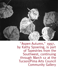 Rachel Brown, author of The Weaving, Spinning and Dyeing Book, has practiced her craft in countless variations, revealing strong influences from the Hispanic and Navajo weavers of the 18th and 19th centuries. Donna Loraine Contractor blends regional influences with a touch of fantasy, creating provocative, dimensional works that provide a view into other worlds. Natural chaos lies at the heart of Donna Martin's weaving. Shuttle magazine has called her work a "dizzying collection of lines running in all directions, which she weaves pick-by-pick, spontaneously." Work by the three artists will be displayed through April 2 in the PCC Art Gallery, 2202 W. Anklam Road. Hours are 10 a.m. to 5 p.m. Monday through Friday, 10 a.m. to 8 p.m. Tuesday. Call 206-6942 for details. FEATHERED FORAY. Did you know that Tohono Chul Park is a veritable aviary-without-walls, and home to feathered friends ranging from the pyrrhuloxia, curve-billed thrasher and cactus wren to Gambel's quail and endless hummingbirds? It's a fact, and one that docents in the serene northwest Tucson sanctuary hanker to share with you. They'll provide guided tours along park trails through some of the best remaining desert in town. The tours are 8 a.m. Monday, Wednesday, Friday and Saturday in Tohono Chul Park, 7366 N. Paseo del Norte. Admission is $2. For details, call 742-6455.