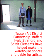 "The Arts District is pushing out and that's great," says Anne Bunker, whose Orts Theatre of Dance is refurbishing the former Rainbo Bakery at the southern end of the massive Tucson Warehouse and Transfer complex. The troupe is building two large studios in the old garage and baking rooms; they'll call the new place Tucson Movement Arts Warehouse. "With this building, and Paul's (at the old Y) and with the artists already here, it's starting to happen. They're finally not ripping buildings down. It's great." THREADED ALONG THE Southern Pacific (now Union Pacific) railroad tracks that slice diagonally north and east across the city's downtown, the warehouses tell a short history of the Tucson that once was. In the years after the turn of the century, all manner of goods coming in by rail made their way into the buildings along Toole Avenue south of the tracks, and along Sixth and Seventh streets to the north. There were food depots, lumber yards, icehouses, a bottling plant, big commercial dry cleaners. By the 1930s, Sixth Avenue, just north of the downtown underpass, had become the pioneer forerunner of the Tucson Auto Mall. Sixth was the hot place to buy a new car, or to get your old car fixed. By the 1970s, though, times had changed. Businesses followed their customers to the edges of the exploding city. Others burned. The neighborhood started a downward slide. Artists have been quietly moving into the raw spaces of the empty warehouses for at least a decade, setting up painting and furniture and small-press studios in the unfinished industrial interiors. But like an actor who becomes an overnight success in Hollywood after long years of hard work in the heartland, the warehouse district all of a sudden is the arty place to be. Consider some of the new residents. Davis Dominguez Gallery, a leading Tucson purveyor of contemporary art, this summer will abandon its perch in the moneyed foothills in favor of a fashionably gritty warehouse location. Starting in August, the new gallery will occupy some 5,200 square feet in the Tucson Warehouse and Transfer Company, the flagship warehouse at 154 E. Sixth St., and display art in a cavernous room with a 20-foot vault ceiling and exposed trusses. Mike Dominguez could hardly contain his glee as he surveyed the building's exterior one cold morning a few weeks ago. "I'm gonna double my business!" he exclaimed. "This may look dead and dull now...but just wait." Owned for the last 10 years by Benjamin Plumbing Supply, the pockmarked 70,000-square-foot building with the landmark tower already houses Benjamin's storage and wholesale plumbing operation, and owner Mark Berman has long rented out some of its spaces to a photographer and a small recording studio. But now he's going into arts development in a big way, signing on Davis Dominguez and Orts as major tenants, and carving out more studio space for visual artists. He plans to move his retail showroom--with its trademark giant bathtub--over from Broadway Boulevard. Positioned side by side, the gallery and showroom will spruce up an entire city block that's long been an eyesore, right at the Stone Avenue entrance to downtown. "The negative image of the area had always outweighed the idea of consolidating our operation in the building," Berman said. "But the image of the area has changed. People are seeing that things are happening. Now this is considered a nice old building that people want to fix up. The time is right." Another investor, Ron Schwabe, "likes warehouses and downtown. He's totally optimistic about the neighborhood," said his spokeswoman, Patricia Esperilla. Schwabe has already converted warehouses into arts spaces in Portland, Ore., and he bought up the Firestone and Bookman Auto Parts buildings at Sixth and Sixth with two partners last fall. The group is actively rehabbing the 38,000 square feet in the two buildings into artists' rental studios and retail space. Tenants who've already signed leases include a graphic designer, a custom furniture maker and a painter who intends to open a gallery/tearoom. "I've been searching," said the painter, George Saah, newly transplanted to Tucson from Washington, D.C. "I almost signed a lease on Congress, but it didn't feel right. This space felt right."