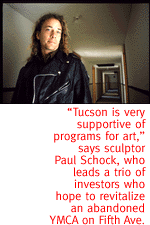![]() A PAINTER PERCHED on top of the old Firestone Building at the corner of Sixth Street and Sixth Avenue one day last week, and carefully leaned over from the roof to brush a fresh coat of red-brown paint onto the store's faded walls. Next door, an architect was scurrying around the massive Tucson Warehouse and Transfer Building, looking over plans to replace its raggedy sheets of plywood with a grid of fashionable glass brick for a new gallery. A block south, on Seventh Street, a team of dancers was hauling debris out of the old Rainbo Bakery. Just to the north, on Fifth Street, seven artists were lugging paints and canvases and clay into spanking new studios in a former dental parts factory. And a hop, skip to the east, at Sixth Street and Fifth Avenue, workers in space suits were gingerly removing asbestos from the basement of the old YMCA building, to make the place safe for the ambitious new International Arts Center.