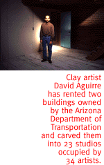 In the aftermath of the Downtown Mile debacle, several dozen buildings slated for demolition now stood idle. The Arizona Department of Transportation went into the landlord business. In a curious way, the limbo imposed on the neighborhood by uncertainty over the future road and by the unusual situation of the state owning property helped trigger the grass-roots arts revival. Barbara Grygutis, a nationally known sculptor of public art, got the idea that the idled buildings would make great art studios. She had her eye on the Steinfeld Warehouse, near her home in El Presidio. "We watched ADOT empty out the buildings. I knew they were empty. Steinfeld is right around the corner from me. It's a historic building and I'm interested in historic preservation. I just called them (ADOT), and said, 'I hear you have vacant space.' " AOT was receptive, but insisted on a set of conditions that ordinary businesses would never accept. Grygutis had to take a 30-day lease, with the building in "as-is" condition; she would be responsible for all repairs and for bringing the structure up to city code. Setting up a model for all the other artists who would later rent the ADOT buildings, she had to clean it of debris and filth, get liability insurance and find subtenants. The Alamo furniture artisans, Charles Alexander of Chax Press, painter Cynthia Miller and clay artist David Aguirre signed on. Aguirre eventually followed Grygutis's example and rented two more ADOT buildings just to the north of Steinfeld, carved them into 23 studios now occupied by 34 artists, and poured in $50,000 of his own money. ("I do the credit card dance," he said.) All along Toole Avenue, as artists Steven Eye, Jessica McCain and Philip Hazard moved in, the peeling facades were transformed by brilliant color. The Toole Shed Studios formed a cooperative at the east end of downtown, offering studios to some 15 artists. Toole Shed, said co-founder James Graham, has always had problems with the roof: The recent rains poured so much water into the studios that several artists were forced to decamp.